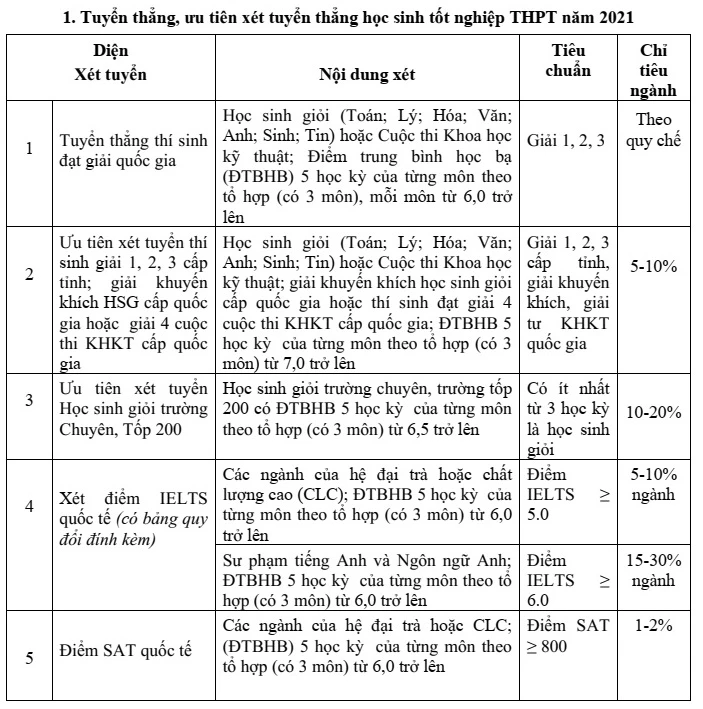 Theo đó, sẽ có sáu nhóm đối tượng thí sinh sẽ được trường tuyển thẳng và ưu tiên tuyển thẳng vào trường. Trong đó, chủ yếu là những em thuộc diện học sinh giỏi ở các kỳ thi cấp quốc gia, học sinh trường chuyên ở top 200, giỏi ngoại ngữ…