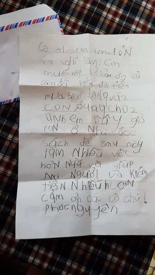 Mẹ của Phúc Nguyên cho biết, cậu đã rất cố gắng để viết bức thư: “Phúc Nguyên mới chỉ biết mặt chữ cái và biết đọc. Việc ghép các chữ cái để ra những ý trong đầu con rất khó khăn. Con đã làm đi làm lại. Lúc nào con nản, con cầu cứu mẹ, mình lại nói với con: “Nếu con không cố gắng viết xong bức thư này, con sẽ không mang sang gửi cô được đâu”. Vậy là bạn ấy là ngồi viết. Chỉ mấy câu thôi nhưng mất tới 2 ngày. Xong, bạn ấy hớn hở xin phép mẹ đạp xe đến đưa thư cho cô chủ quán”.