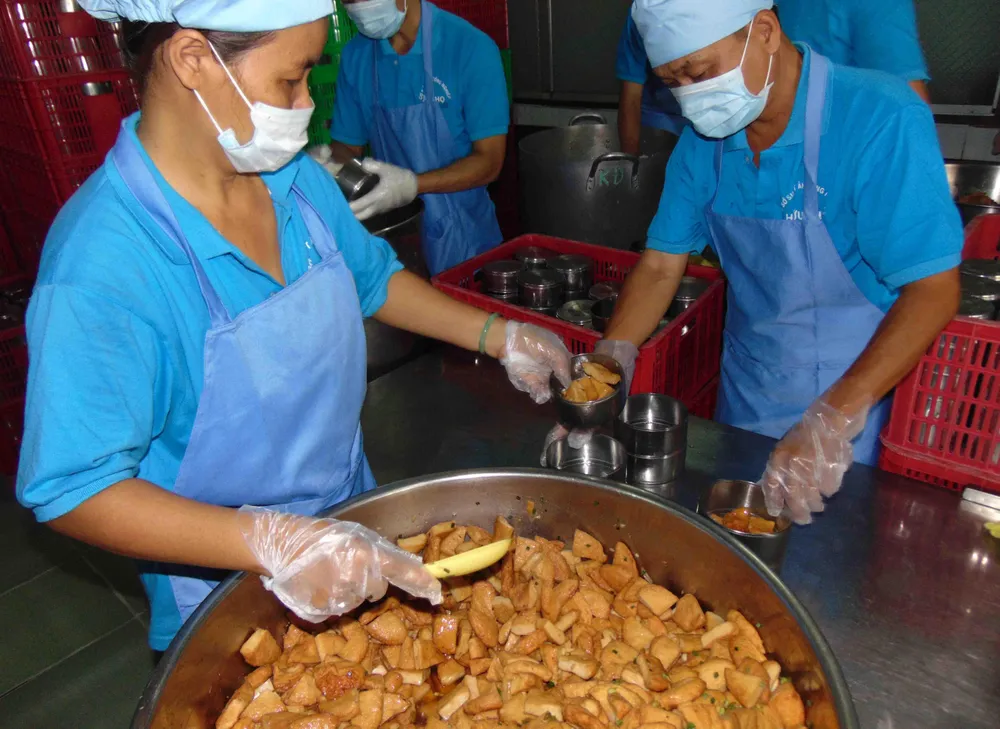 Nhân viên cơ sở cung cấp suất ăn sẵn Hữu Thọ (quận 12) đang cho thức ăn vô khay để phục vụ học sinh. Ảnh: TRẦN NGỌC