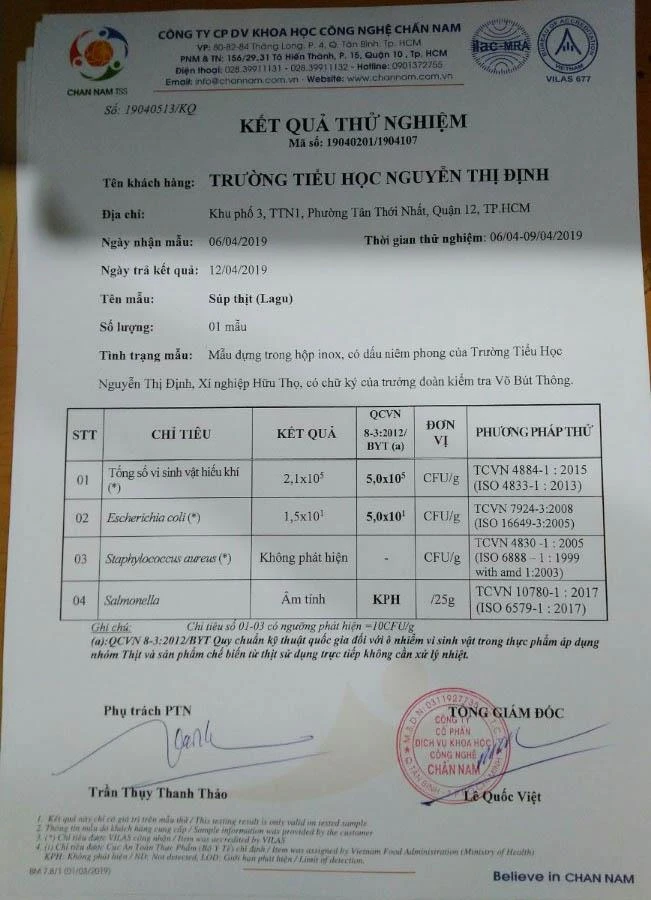 Ngoài ra, kết quả xét nghiệm cháo thịt bò cũng không phát hiện vi khuẩn Escherichia coli và Salmonella. Riêng chỉ tiêu tổng số vi sinh vật hiếu khí nằm dưới quy chuẩn cho phép của Bộ Y tế.