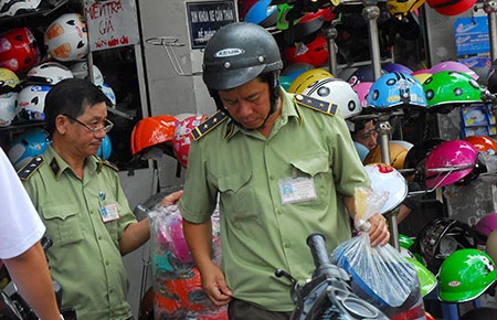 Quản lý thị trường TP.HCM kiểm tra, thu hồi mũ bảo hiểm không đạt chuẩn tại một cửa hàng. Ảnh: HTD