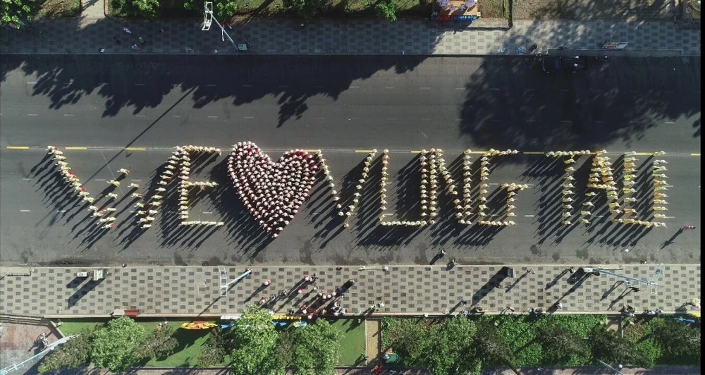 600 phụ nữ trình diễn áo dài xếp thành dòng chữ “WE♥VUNGTAU” . Ảnh: TK