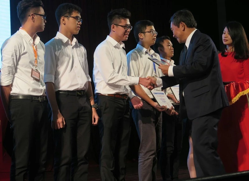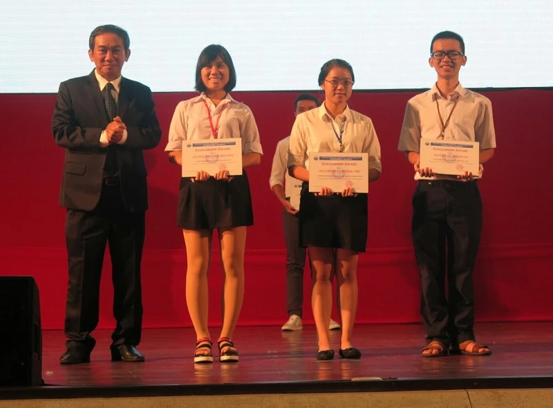 PGS-TS Hồ Thanh Phong, Hiệu trưởng nhà trường, trao học bổng toàn phần cho các tân SV đạt thành tích cao trong kỳ tuyển sinh vừa qua.