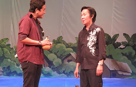 Từ trái qua, nghệ sĩ Trọng Phúc vào vai Nhuận Điền và nghệ sĩ Vũ Linh vào vai Trần Minh trong lúc tập vở Bên cầu dệt lụa. Ảnh: HÒA BÌNH