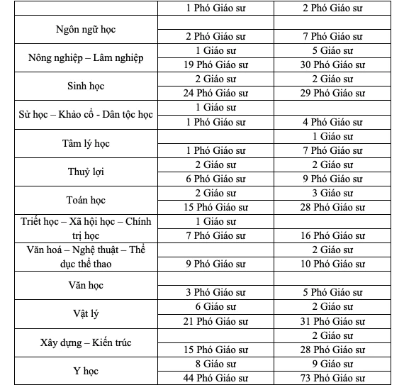 Các Hội đồng Giáo sư cơ sở có ít ứng viên được đề nghị xét công nhận đạt tiêu chuẩn chức danh GS, PGS năm 2023 gồm Hội đồng Giáo sư ngành Luyện kim chỉ có 3 người; Hội đồng Giáo sư liên ngành Sử học - Khảo cổ học - Dân tộc học có 4 người; Hội đồng Giáo sư ngành Văn học có 5 người; Hội đồng Giáo sư ngành Ngôn ngữ học với 7 người; Hội đồng Giáo sư ngành Tâm lý học có 8 người...