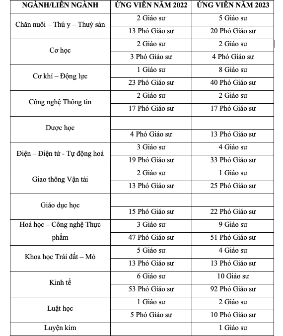 Năm 2022, đã có 394 ứng viên (36 ứng viên Giáo sư và 358 ứng viên Phó Giáo sư) được các Hội đồng Giáo sư ngành, liên ngành đề nghị xét Hội đồng Giáo sư Nhà nước xét công nhận đạt tiêu chuẩn chức danh Giáo sư, Phó Giáo sư.