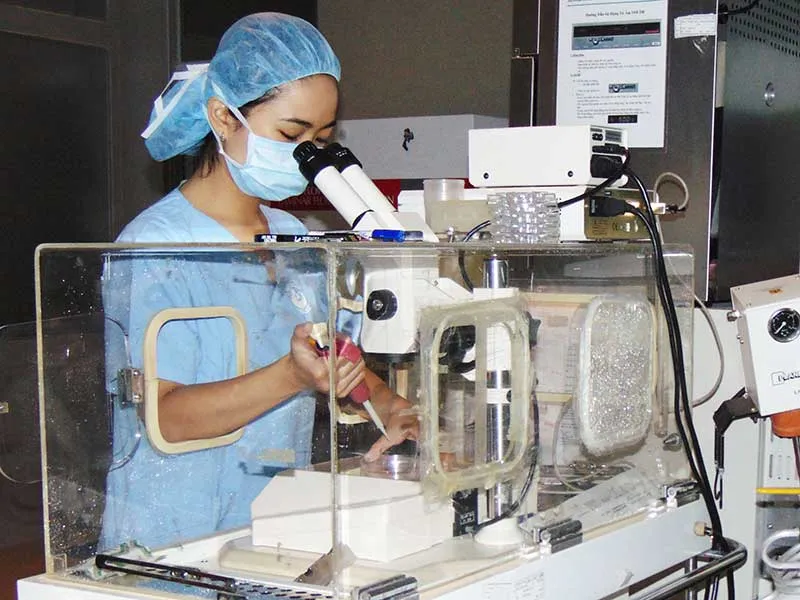 Nhân viên khoa Hiếm muộn BV Từ Dũ (TP.HCM) kiểm tra phôi trước khi chuyển vào tử cung người mang thai hộ. Ảnh: TRẦN NGỌC