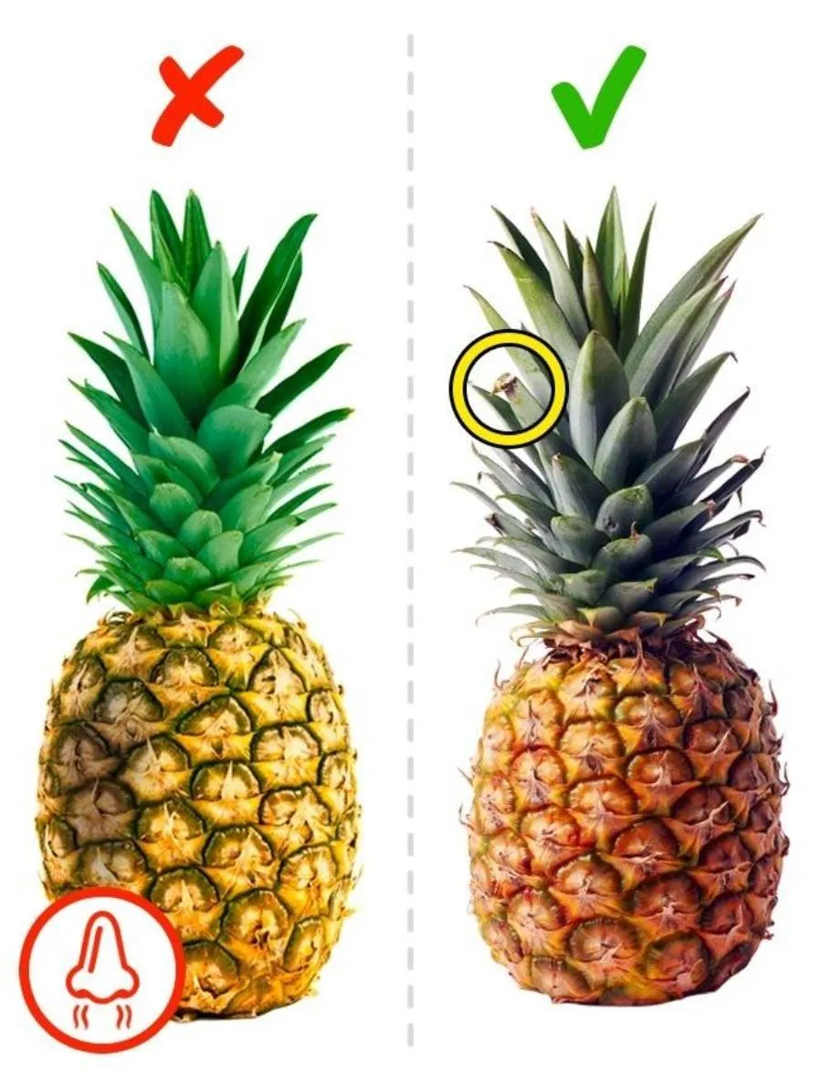 Thực tế thì quả dứa có lá hơi ngả nâu, hơi héo một chút sẽ ngon và ngọt hơn. Bạn nên chọn quả dứa có màu sắc đồng đều và không bị đốm nhé.
