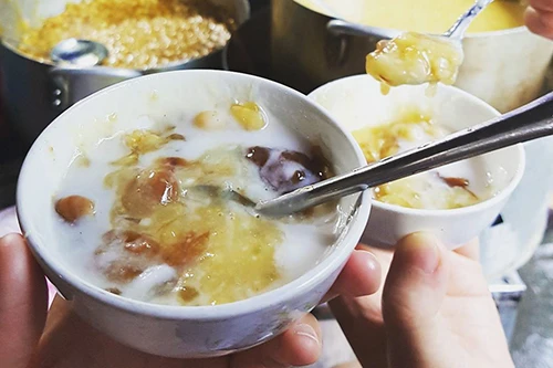 Điều có lẽ "cám dỗ" du khách nhiều nhất ở bên trong chợ là những sạp chè với nhiều màu sắc. Những ly sương sa hột lựu hay chén chè bà ba, đậu xanh… thích hợp cho những người hảo ngọt, ăn kèm đá. Mỗi ly chè có giá trung bình 8.000-10.000 đồng, tùy loại và tùy hàng quán. Ảnh: Pronet