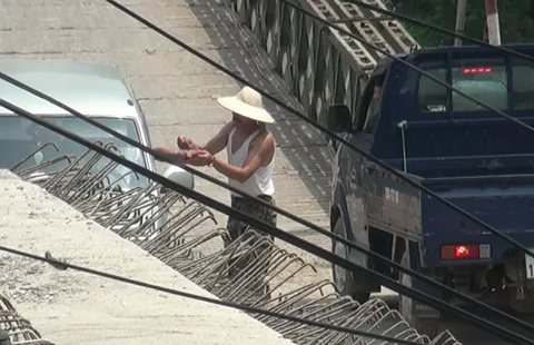 Công trình đắp chiếu nhiều năm nên người dân phải đi nhờ cầu tạm. Nhân dịp này một số công nhân của đơn vị thi công lập chốt trên cầu tạm để thu từ 20.000 đến 50.000 đồng/lượt ô tô. Theo ghi nhận, chỉ trong vòng một giờ đã có hơn 20 lượt ô tô các loại qua cầu tạm nhưng không có vé hay biên lai.