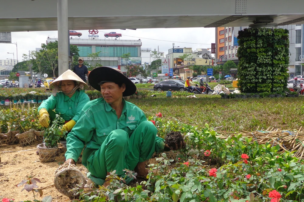 Dưới dạ cầu vượt nơi các mũi tàu, khoảng trống, dải phân cách đang được trồng cây xanh, điểm bông hoa. Các trụ cầu thép bóng lỳ, trơn nhẵn cũng được "phủ" các dàn bông hoa trang trí. Đây là cầu vượt đầu tiên ở TP có phần trang trí bông hoa ở các trụ cầu. Đây sẽ là "điểm nhìn" cho khách đi-đến từ sân bay Tân Sơn Nhất.