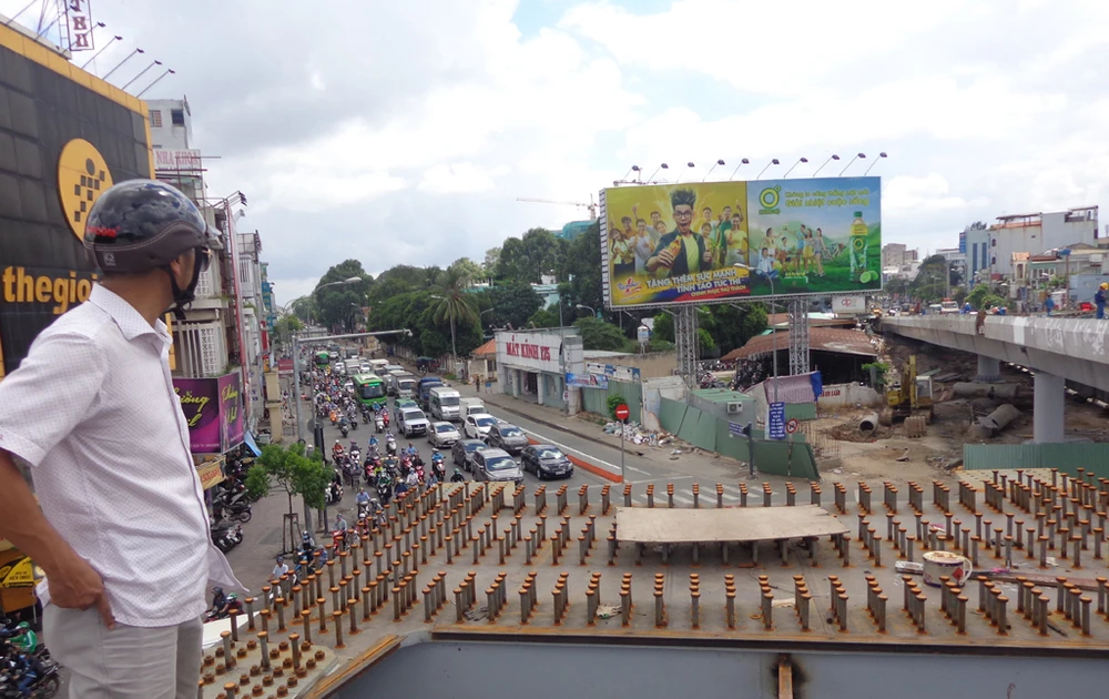 Ở hướng từ đường Nguyễn Kiệm qua (theo hướng tay chỉ của chỉ huy công trường) còn vướng 58 hộ chưa giải tỏa xong nên nhánh từ Nguyễn Kiệm qua Nguyễn Thái Sơn phải đợi đến đầu năm 2018 mới thi công được.