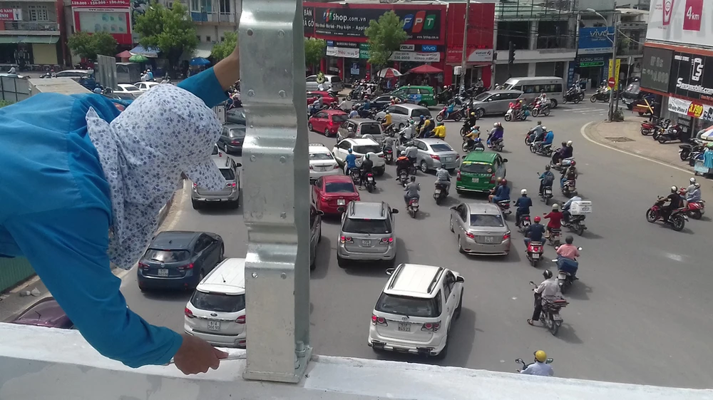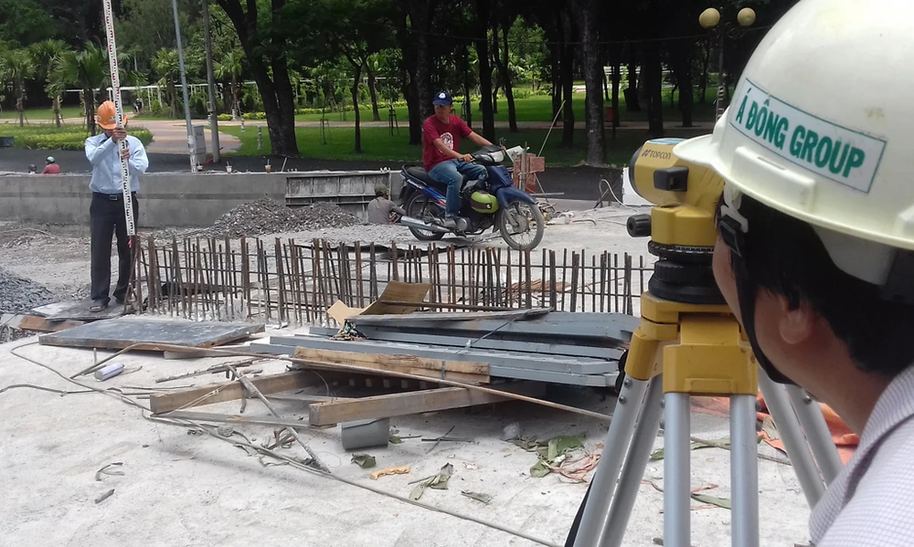 Cho đến chiều 26-6, các cán bộ kỹ thuật đang đo lấy cao độ chuẩn bị cho việc trải nền đường dẫn vào cầu vượt theo hướng từ đường Hoàng Minh Giám qua Nguyễn Thái Sơn.