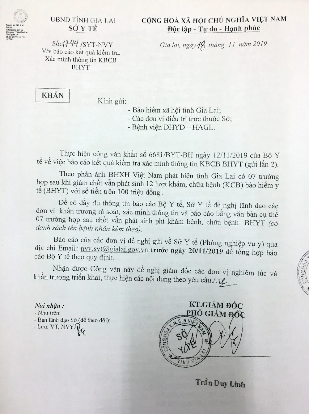 Sở Y tế tỉnh Gia Lai ra văn bản khẩn là thực hiện theo Công văn số 6681/BYT-BH ngày 12-11-2019 của Bộ Y tế chỉ đạo kiểm tra, xác minh thông tin và báo cáo kết quả khám chữa bệnh bảo hiểm y tế đối với bảy trường hợp nêu trên.