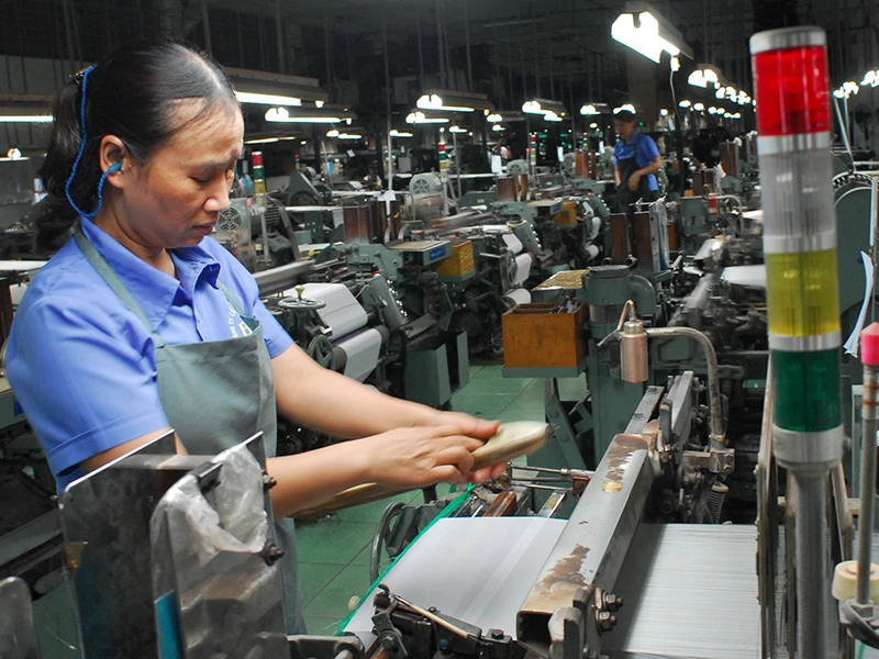 Nhiều giải pháp tháo gỡ khó khăn, tạo thuận lợi cho doanh nghiệp ổn định sản xuất trong việc ứng phó với dịch COVID-19. Trong ảnh: Dây chuyền sản xuất tơ lụa Bảo Lộc. Ảnh: HTD