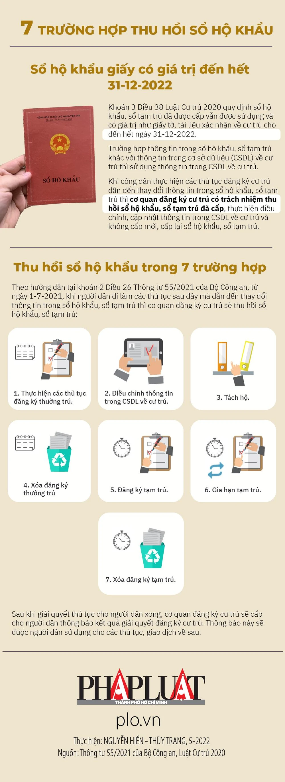 (PLO)-  Khi công dân thực hiện các thủ tục đăng ký cư trú dẫn đến thay đổi thông tin trong sổ hộ khẩu, sổ tạm trú thuộc 7 trường hợp dưới đây thì cơ quan đăng ký cư trú sẽ thu hồi sổ hộ khẩu.