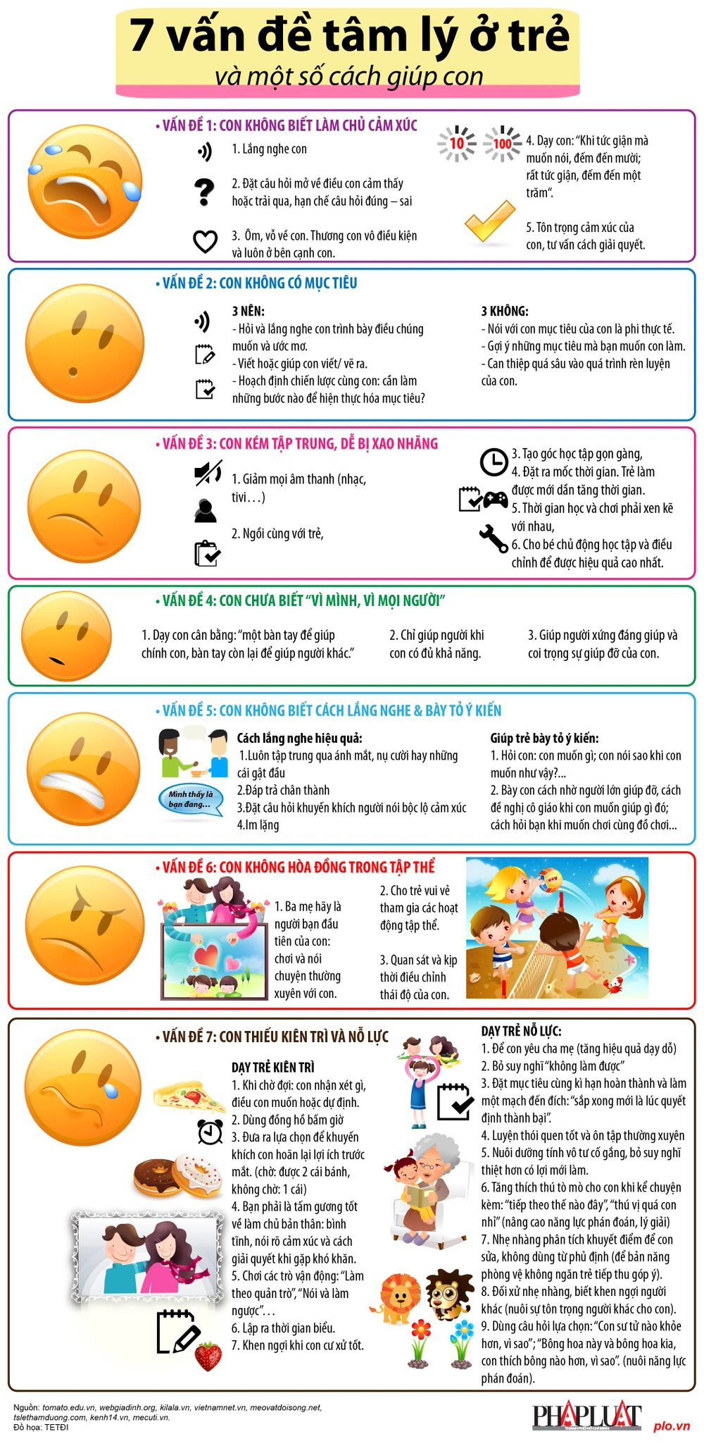 (PLO)- Trẻ không biết làm chủ cảm xúc; không có mục tiêu; kém tập trung, dễ xao nhãng; chưa biết "vì mình, vì mọi người"; không biết cách lắng nghe và bày tỏ ý kiến; không hòa đồng trong tập thể; thiếu kiên trì và nỗ lực. Đây là bảy vấn đề tâm lý thường gặp ở trẻ em. Xin gửi đến quý phụ huynh một số gợi ý giúp trẻ.