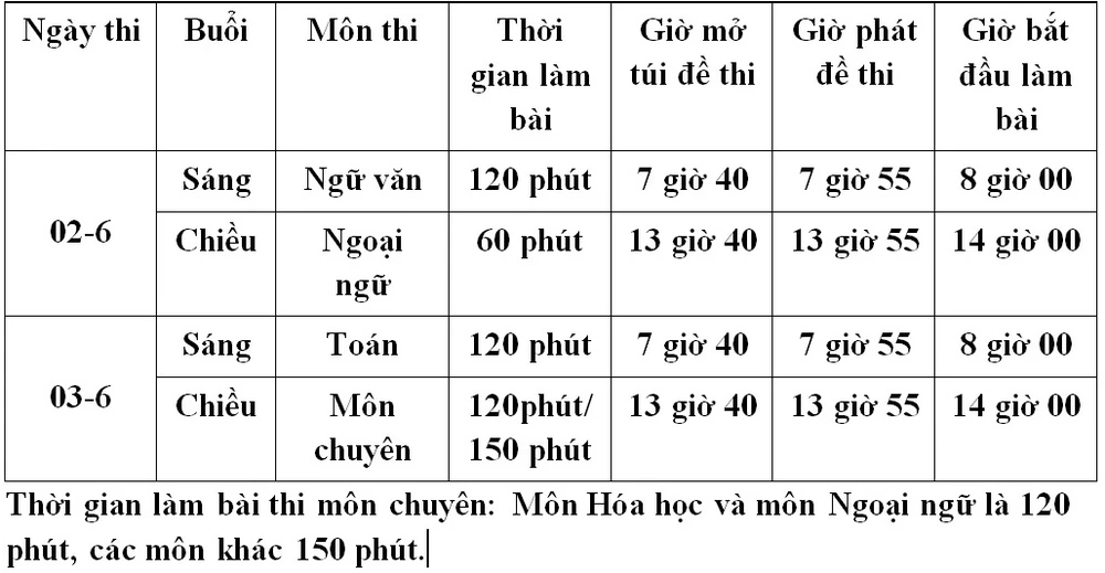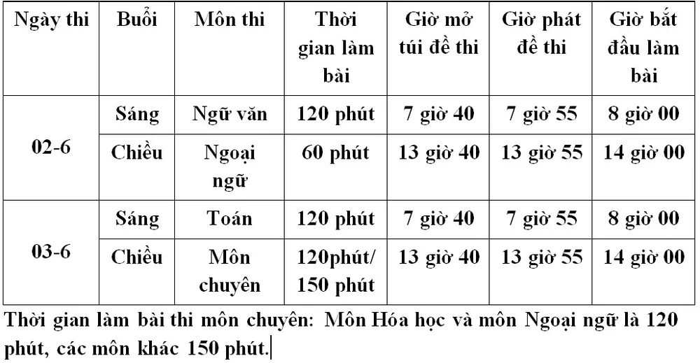 Kỳ thi sẽ diễn ra trong hai ngày 2 và 3-6 với ba môn lần lượt là: ngữ văn (120 phút), ngoại ngữ (60 phút) và toán (120 phút). Các bài thi chuyên sẽ thi chiều ngày 3-6, trong đó, môn hóa học và môn ngoại ngữ là 120 phút, các môn khác là 150 phút.