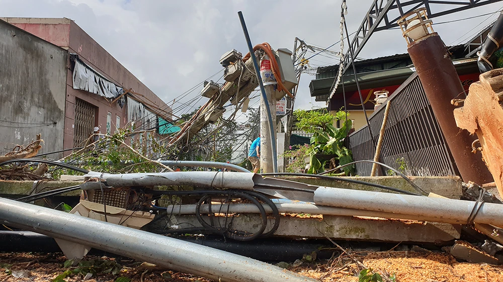 Một cột điện đôi đoạn giao lộ giữa đường Lê Thánh Tôn - Mai Đình Dũng bị gió bẻ gãy ngang.