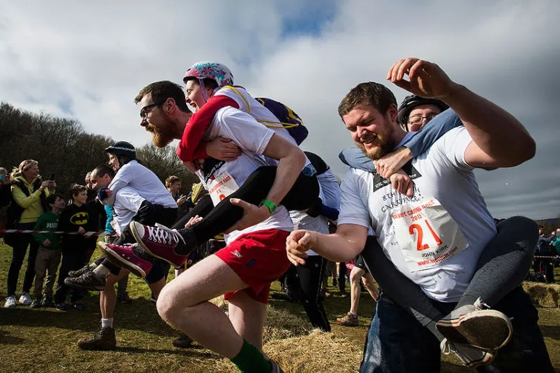 Ở Anh, cuộc đua này rất hào hứng khi được tổ chức ngoài trời trên những bãi cỏ, đường đồi, dốc và chướng ngại vật tự tạo có hoặc do chính những khán giả là gia đình các vận động viên hào hứng mang những xô nước hay bất cứ gì có thể chứa nước được ra xịt để làm khó cho các cặp đội.