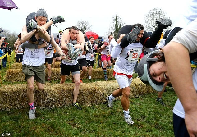 Cuộc đua diễn ra trong tiếng cười sàng khoái dù các ông chồng bở hơi tai với trên 49kg trên vai.