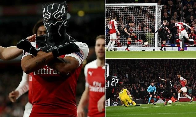 Aubameyang đeo mặt nạ ngộ nghĩnh ăn mừng bàn thắng.