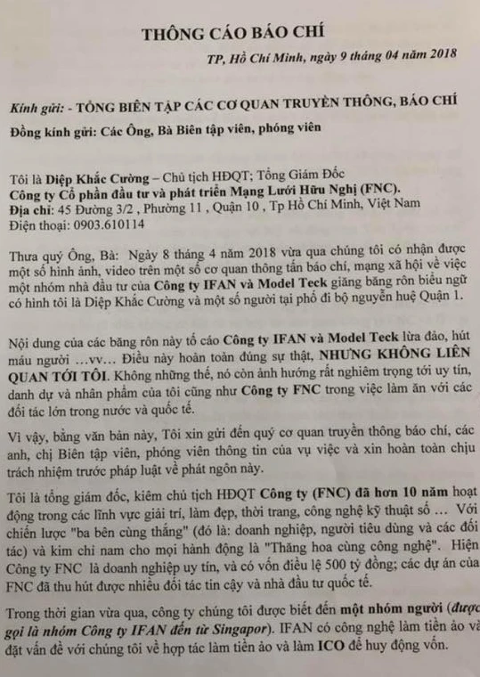 "Do không biết công ty này có dấu hiệu lừa đảo nên năm 2017, tôi có tham dự hai buổi nói chuyện về các dự án và hoạt động của FNC. Khi biết công ty này có dấu hiệu lừa đảo thì tôi đã cảnh báo nhà đầu tư và không liên quan đến việc bán ICO phục vụ cho động cơ của dự án ifan.