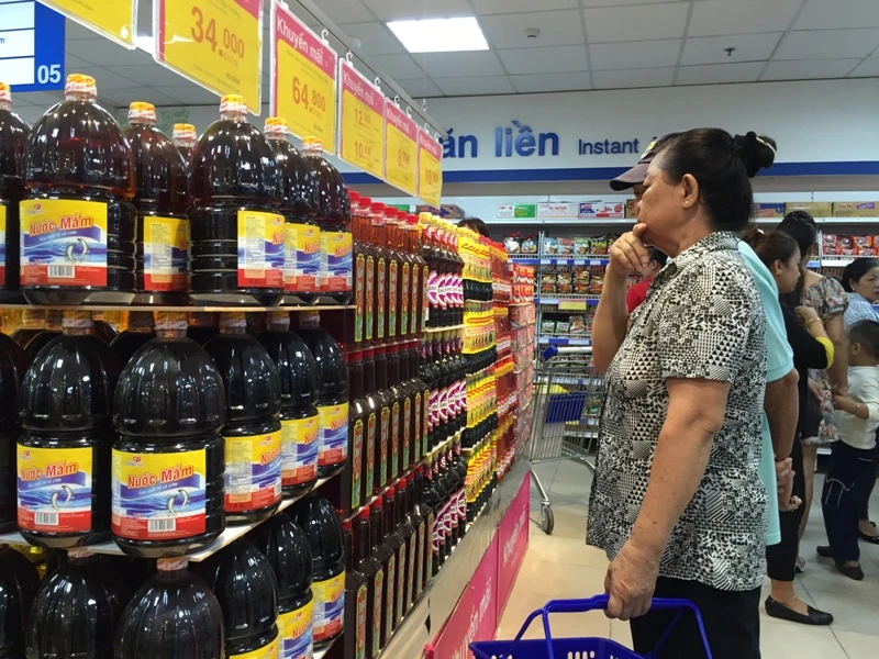 Người tiêu dùng đang chọn mua nước mắm truyền thống tại siêu thị
