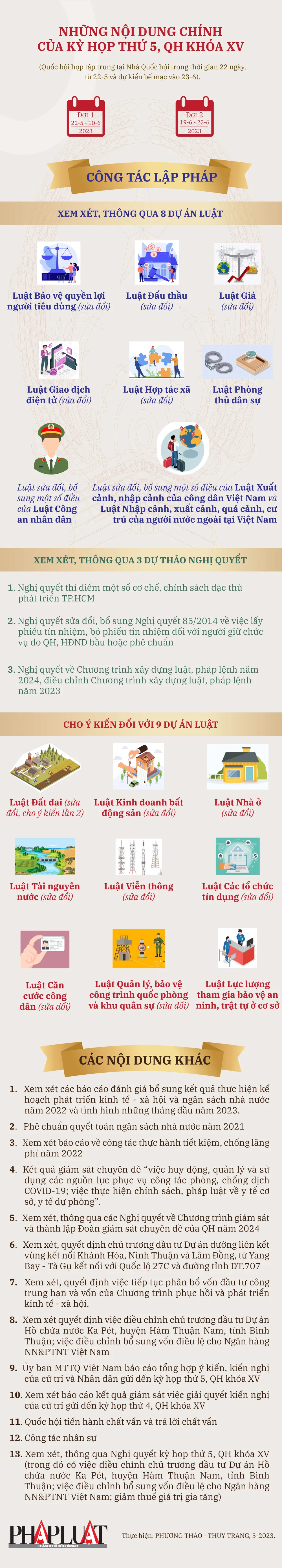 (PLO)- Theo chương trình dự kiến, Kỳ họp thứ 5, Quốc hội khóa XV sẽ họp tập trung trong 22 ngày và chia làm hai đợt; xem xét, thông qua 8 dự án luật, ba dự thảo nghị quyết và cho ý kiến với chín dự án luật quan trọng khác.