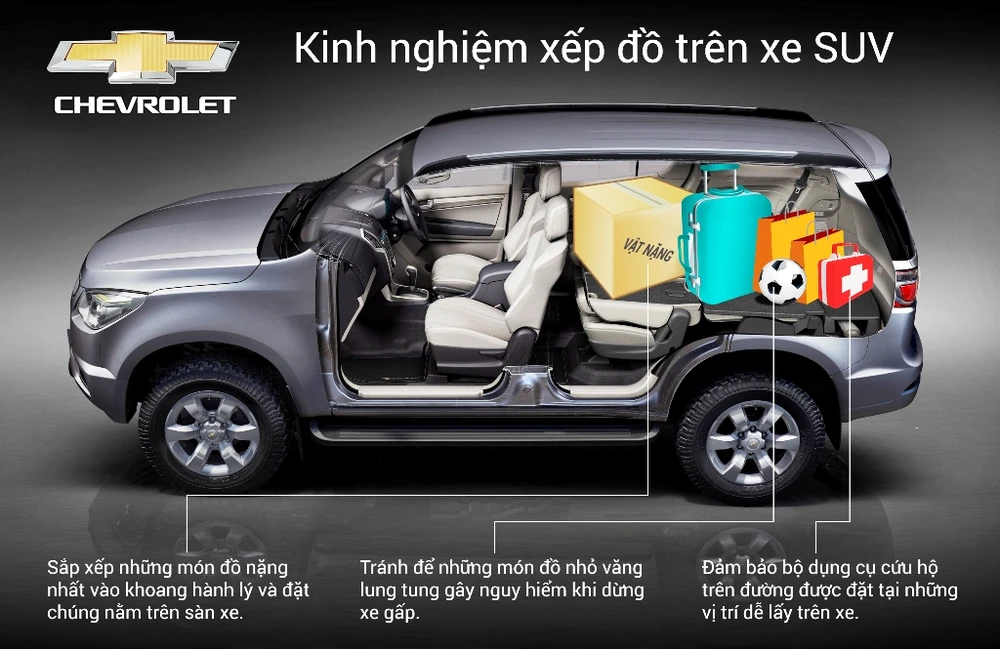 Tại Việt Nam, ngày càng có nhiều khách hàng chuyển từ các mẫu xe du lịch gầm thấp sang xe thể thao đa dụng SUV, một phần do muốn tận dụng lợi thế ở thiết kế nội thất linh hoạt của phân khúc này. Dòng SUV với ba hàng ghế có thể gập phẳng, có thể cung cấp nhiều giải pháp khác nhau khi chở người và chở đồ. Dưới đây là một số lời khuyên khi sắp xếp đồ đạc của các chuyên gia đến từ General Motors: