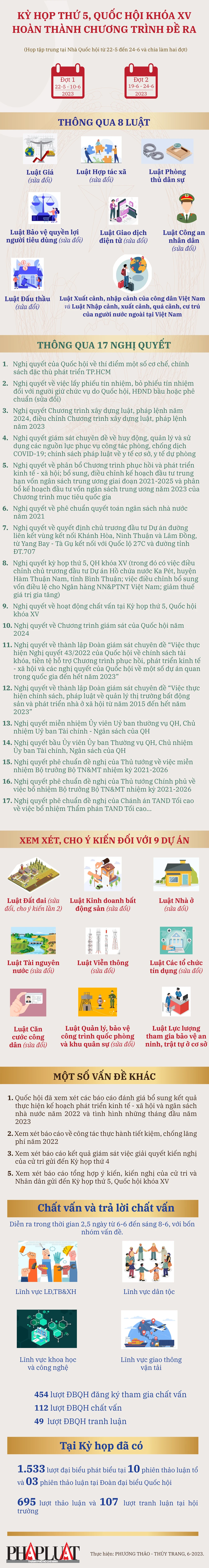 (PLO)- Sau 23 ngày làm việc, kỳ họp thứ 5 Quốc hội khóa XV đã thành công tốt đẹp. Quốc hội đã thông qua tám dự án luật; 17 Nghị quyết; xem xét, cho ý kiến chín dự án luật cùng nhiều vấn đề quan trọng về kinh tế - xã hội.
