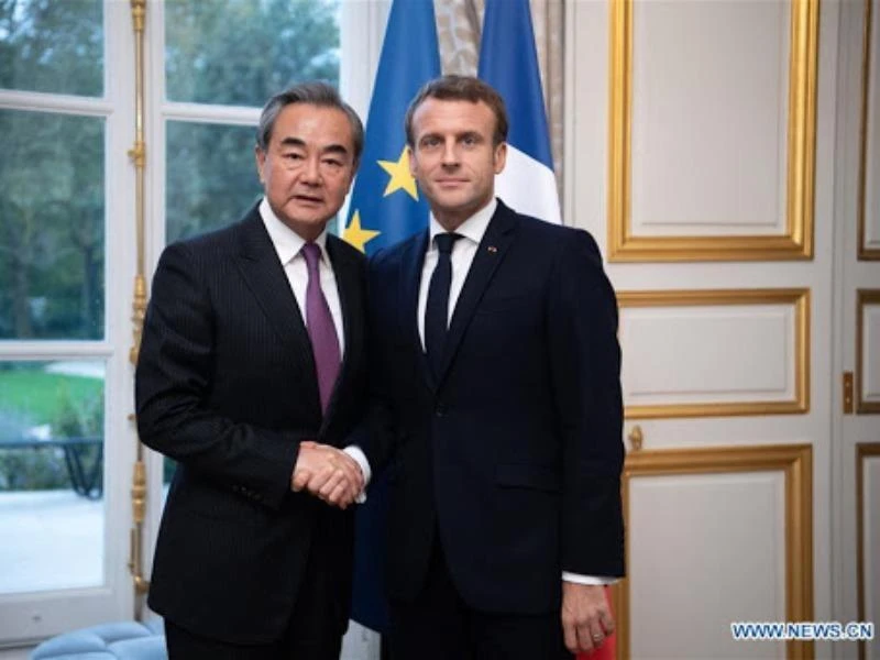 Bộ trưởng Ngoại giao Trung Quốc Vương Nghị (trái) và Tổng thống Pháp Emmanuel Macron. Ảnh: TÂN HOA XÃ