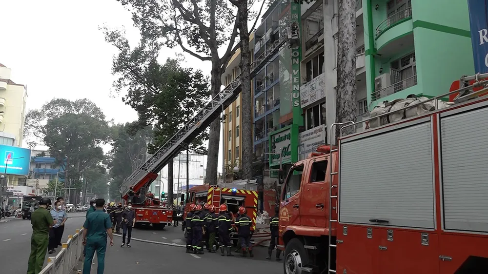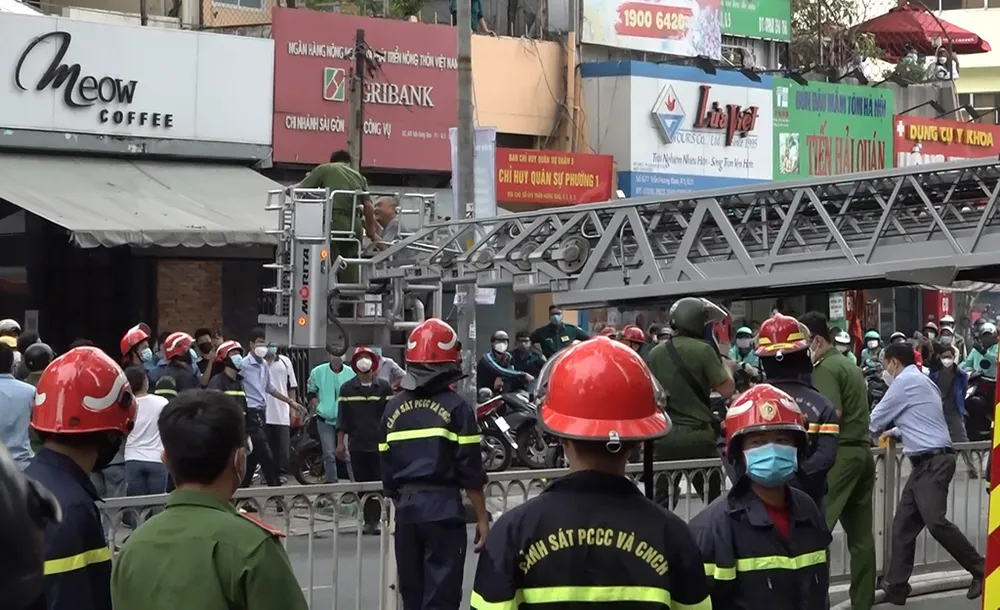 Cảnh sát PCCC và CNCH Công an TP.HCM điều động nhiều phương tiện bao gồm cả xe thang cùng hàng chục cán bộ chiến sĩ đến hiện trường triển khai công tác cứu người, dập lửa.