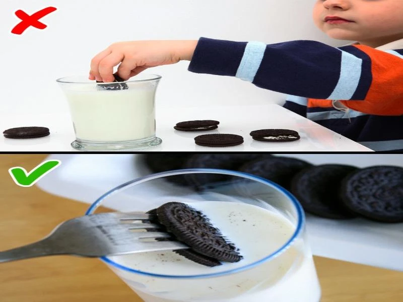 1. Chấm bánh vào ly sữa bằng tay