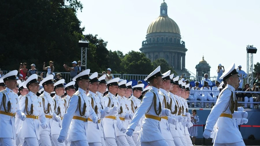 Binh sĩ Nga duyệt binh nhân Ngày hải quân Nga ở St.Petersburg. Ảnh: SPUTNIK