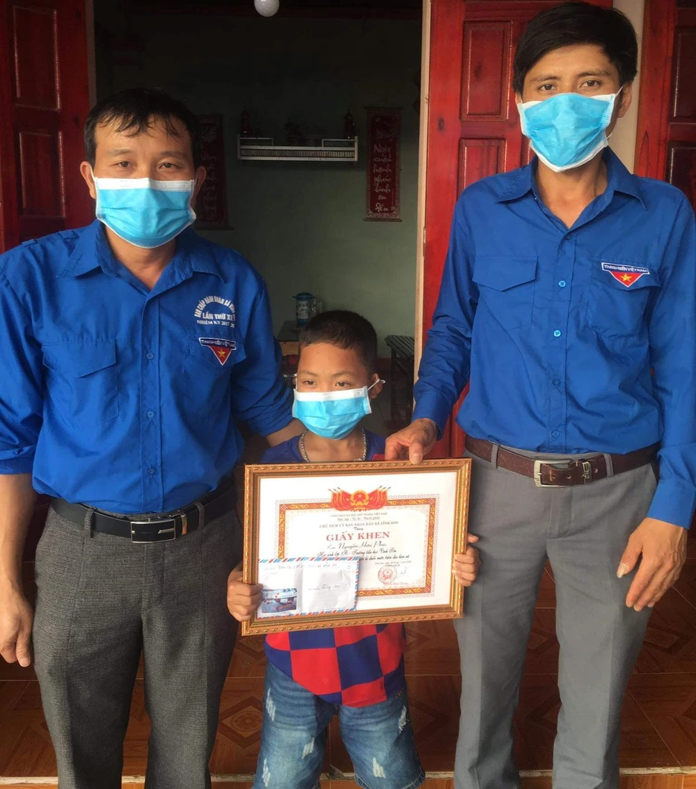 Đoàn xã Vĩnh Sơn cùng liên đội Trường Tiểu học và THCS Vĩnh Sơn đã biểu dương, khen thưởng “nóng” cho em Phúc.