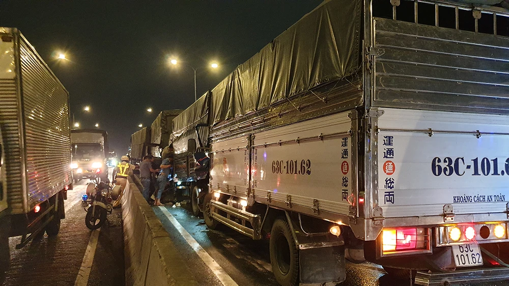 Tám xe gồm năm xe tải, một xe đầu kéo, một bán tải và xe bảy chỗ hư hỏng nằm chắn một làn đường gây kẹt cứng kéo dài nhiều km hướng về vòng xoay An Lạc. Lực lượng cảnh sát giao khá vất vả điều tiết, xử lý hiện trường tai nạn.