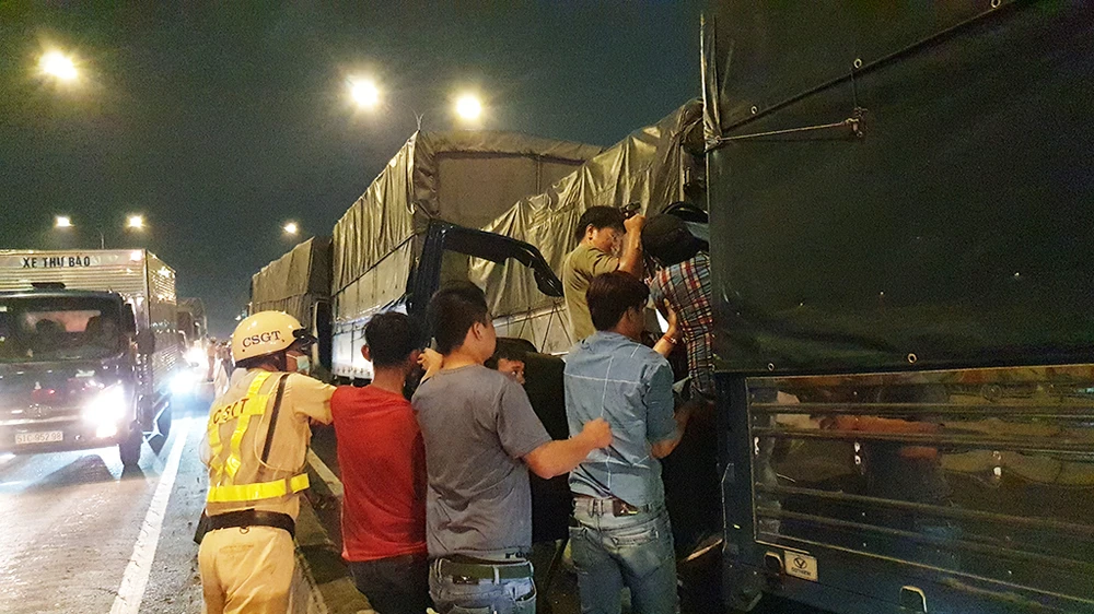 Lực lượng chức năng phối hợp với các tài xế đưa tài xế bị thương vào bệnh viện cấp cứu. Ảnh NT