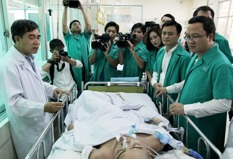 Phó Chủ tịch chuyên trách Ủy ban ATGT Quốc gia Khuất Việt Hùng, Giám đốc Sở GTVT Bùi Xuân Cường (thứ tự từ phải sang) cùng các bác sĩ BV Chợ Rẫy đi thăm và tặng quà các nạn nhân bị TNGT. Ảnh: HOÀNG GIANG