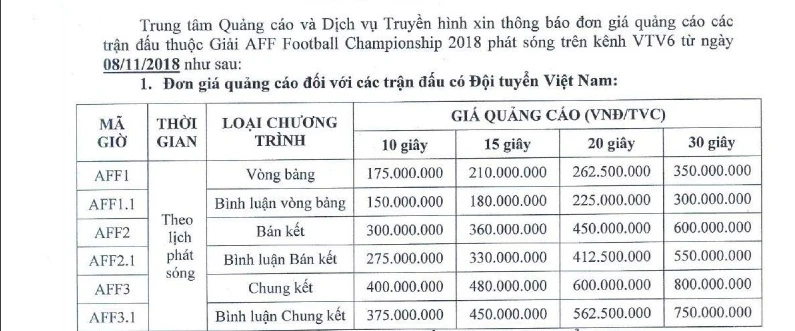 Mỗi spot quảng cáo các trận đấu không có đội Việt Nam, giá thấp hơn rất nhiều. Nếu Việt Nam không có mặt tại trận chung kết, spot 30 giây cao nhất là 50 triệu đồng.