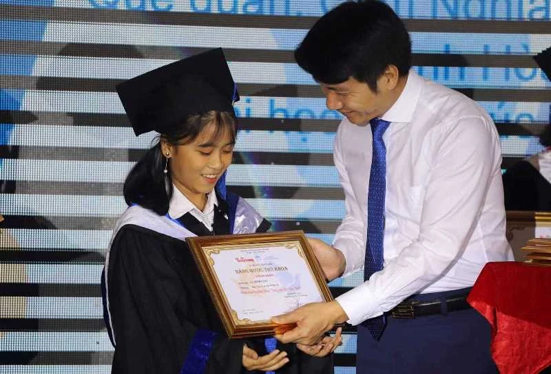 Các tân thủ khoa nhận học bổng tại buổi lễ. Ảnh: PHẠM ANH