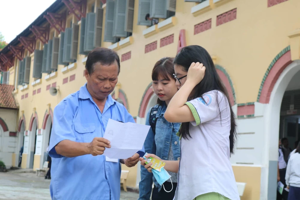 Trong khi đó, ngoài sân trường, bác bảo vệ nhiệt tình hướng dẫn một nhóm thí sinh tìm phòng thi của mình. Ảnh: Thủy Trúc