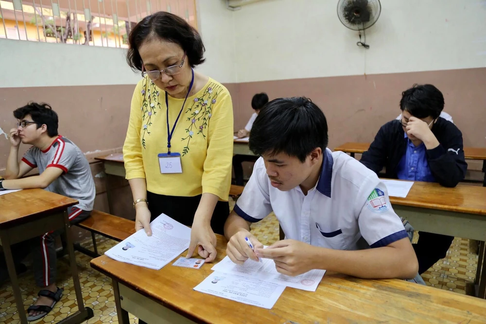 Các giám thị họp trước giờ làm thủ tục thi tại điểm thi trường THPT Nguyễn Thượng hiền, TP.HCM. Ảnh: Hoàng Giang