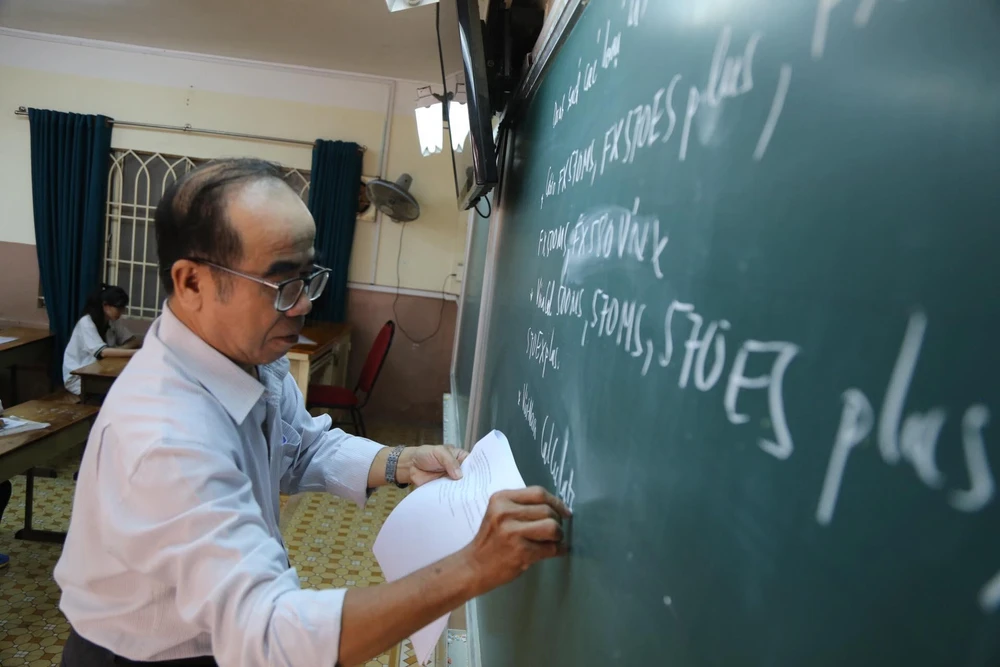 Một cán bộ coi thi viết danh sách các loại máy tính được mang vào phòng thi để nhắc nhở thí sinh. Ảnh: Hoàng Giang