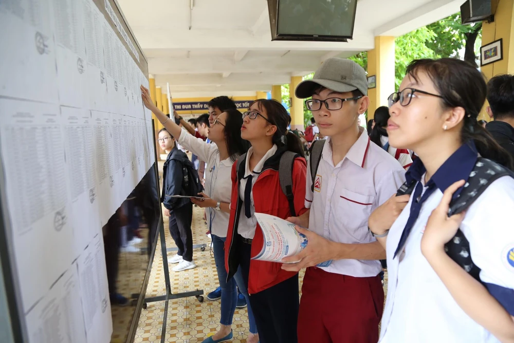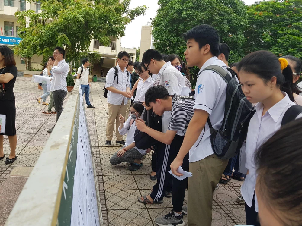Các thí sinh xem danh sách phòng thi tại điểm thi trường THPT Phú Nhuận, TP.HCM. Ảnh: Phạm Anh