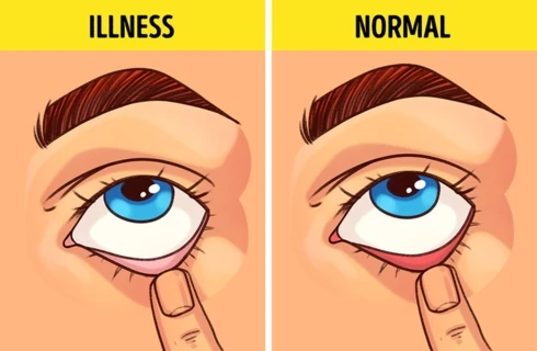 Kiểm tra nguy cơ thiếu máu: Kéo mí mắt dưới của bạn xuống. Nếu thấy trong mắt là màu hồng thì mọi thứ đều ổn. Còn nếu bạn bị thiếu máu, màu sắc trong mí mắt có thể là màu hồng nhạt hoặc thậm chí là màu vàng.