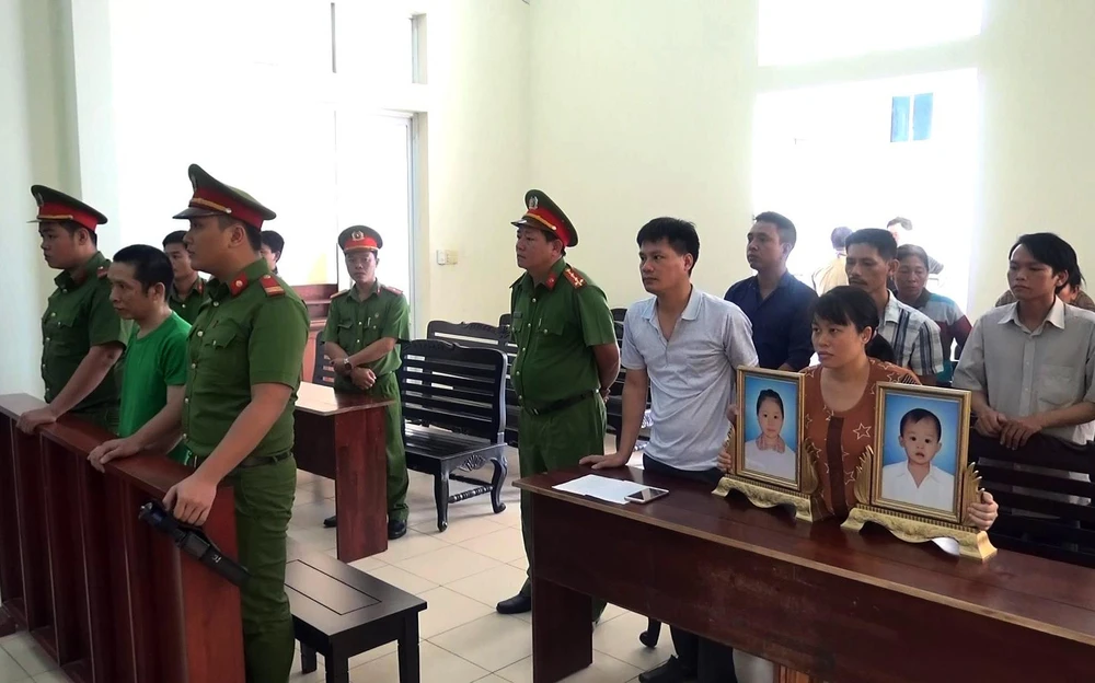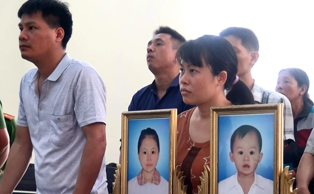 Cha mẹ nạn nhân mang di ảnh hai con đến tòa