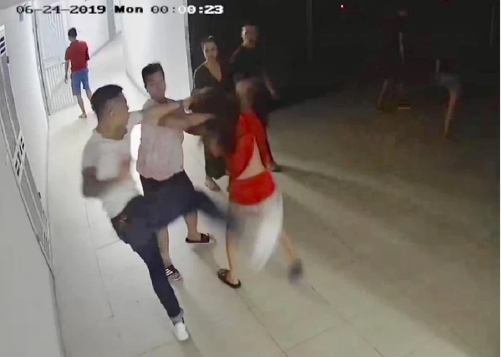 Một lúc sau, khi chị T. vừa đi ra hành lang thì bị hai phụ nữ túm tóc, đánh vào mặt. Một nam thanh niên áo trắng, quần đen cũng lao vào đấm đá.