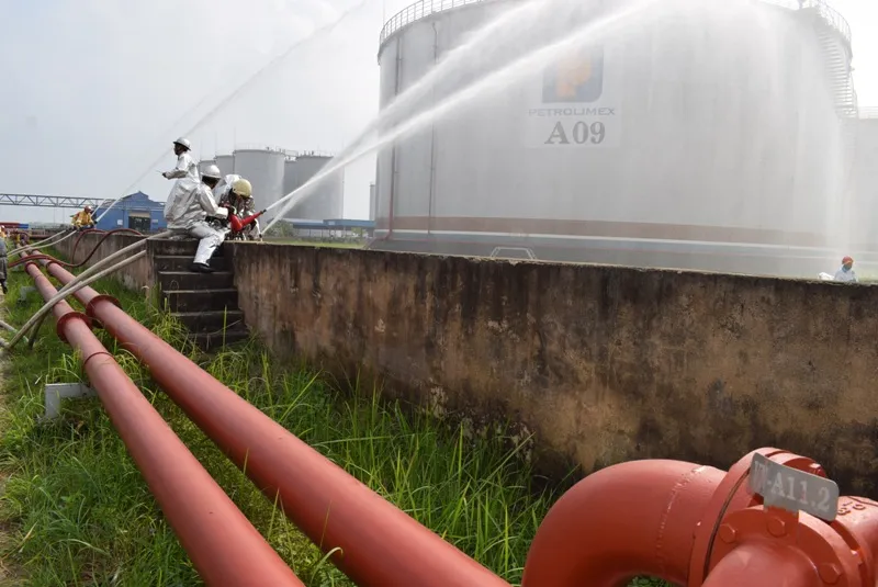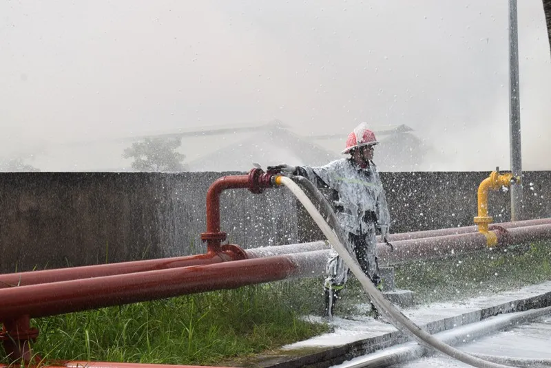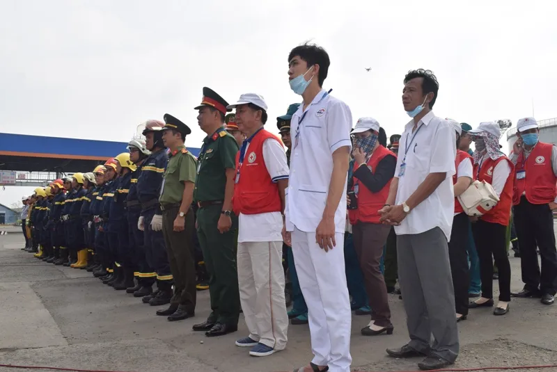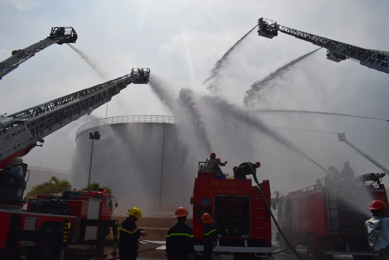 Hơn 30 phút, buổi diễn tập kết thúc. Đám cháy dần được khống chế, chuyển sang giai đoạn làm mát toàn bộ bể bị cháy, ngăn chặn đám cháy bùng phát trở lại.