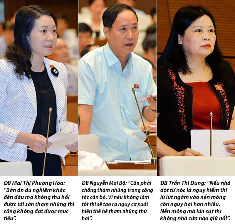 Cùng nội dung, ĐB Mai Thị Phương Hoa (Nam Định) cho rằng dù tòa án có tuyên những bản án nghiêm khắc đến đâu mà không thu hồi được tài sản tham nhũng thì việc xử lý tham nhũng coi như chưa triệt để, không đạt được mục tiêu.